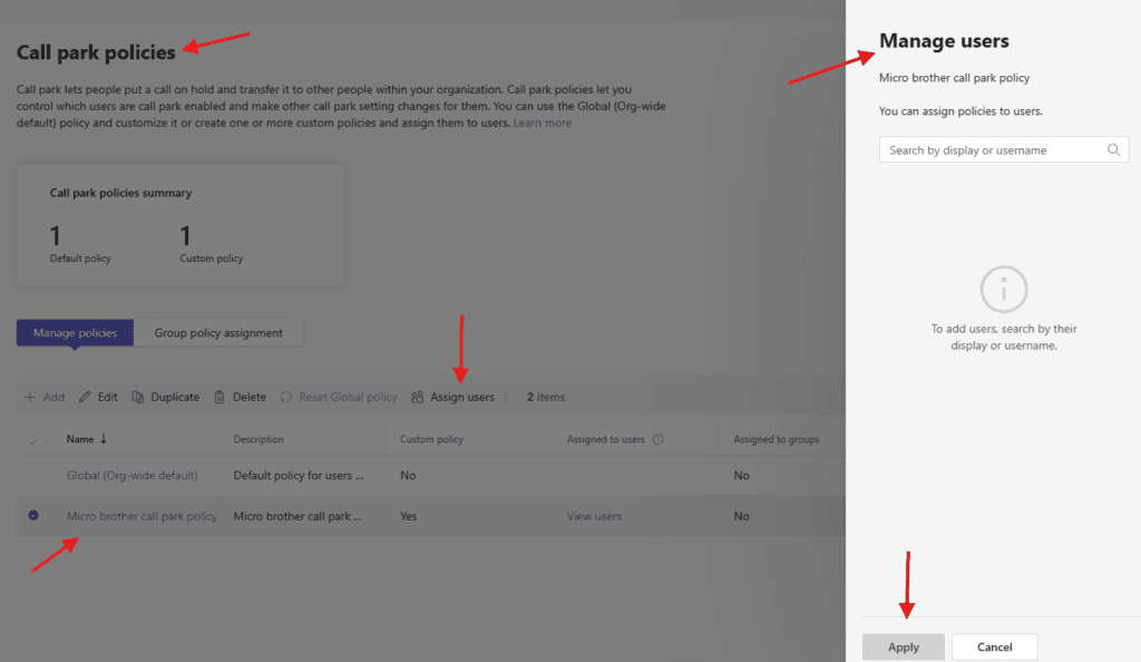 It lets people put a call on hold and transfer it to other people within your organization. Call park policies let you control which users are call park enabled and make other call park setting changes for them
