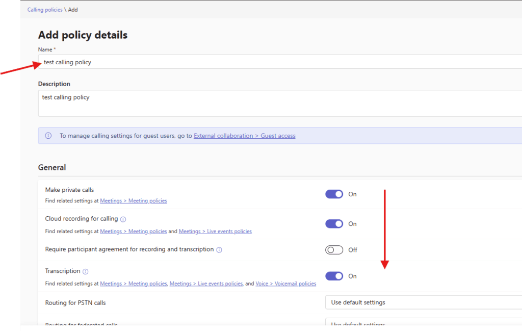 This setting controls whether transcription is available for users, Routing for PSTN calls,