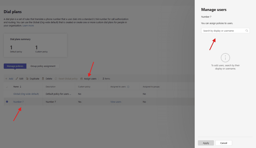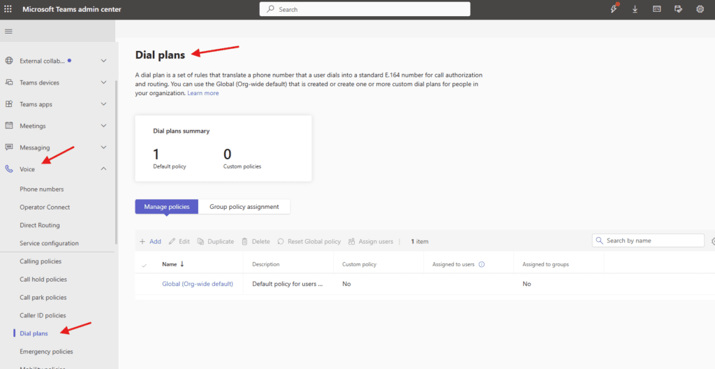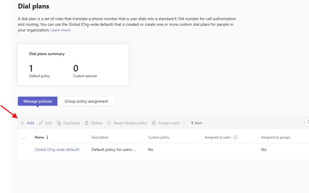Lets add one : You can use the Global (Org-wide default) that is created or create one or more custom dial plans for people in your organization