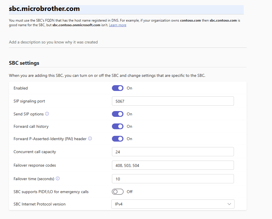 You must use the SBC’s FQDN that has the host name registered in DNS. For example, if your organization owns microbrother.com then sbc.microbrother.com is good name for the SBC, but sbc.microbrother.onmicrosoft.com isn’t