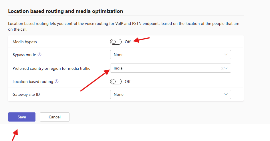 Make sure to set this attribute Preferred country or region for media traffic as This ensures media traffic is routed to the nearest Microsoft datacenter, rather than relying on default routing, I have selected India as I am from India.