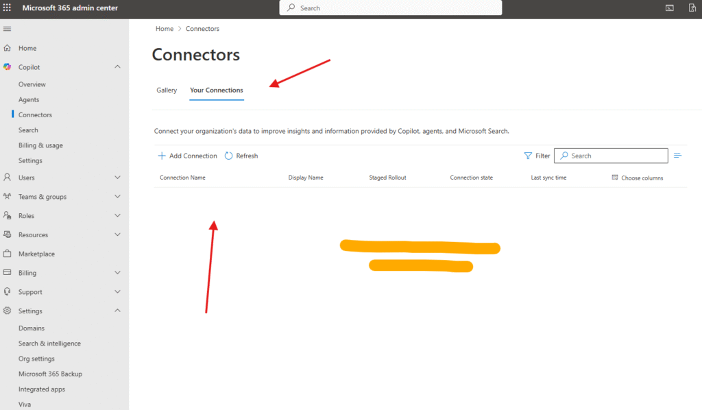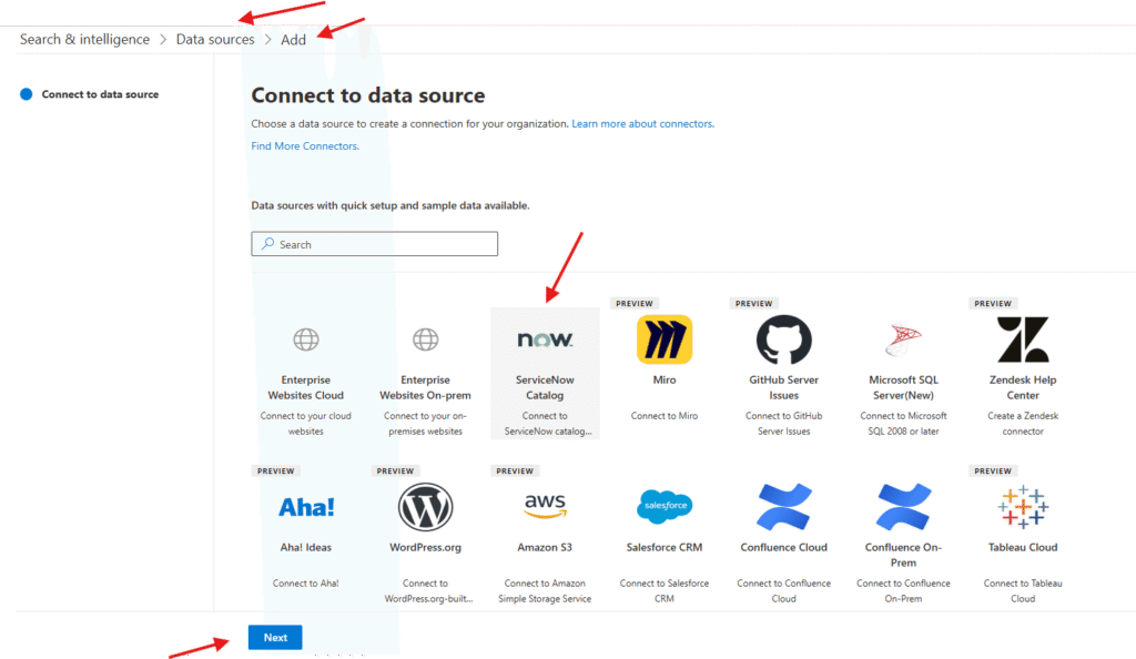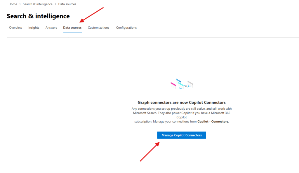 Navigate to settings –> search & intelligence –> overview –> connectors –> add your first connection
