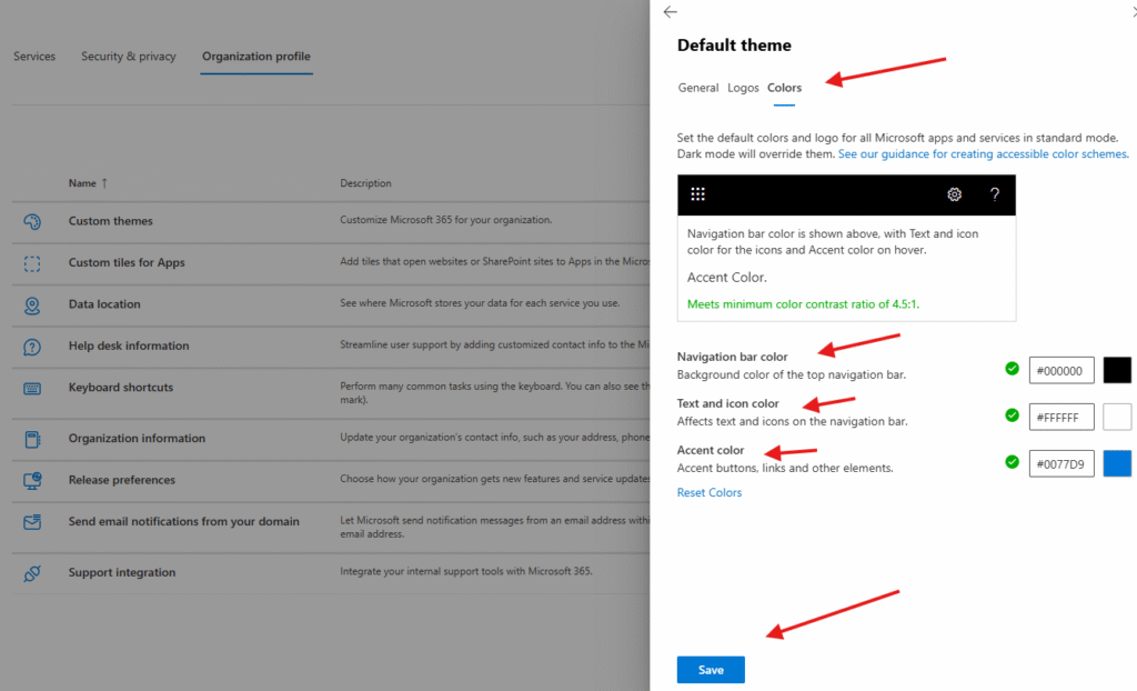 Set the default colors and logo for all Microsoft apps and services in standard mode.
