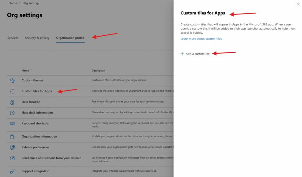Also you can add Custom tiles for Apps ( see below snippet) : custom tiles that will appear in Apps in the Microsoft 365 app. When a user opens a custom tile, it will be added to their app launcher automatically to help them access it quickly