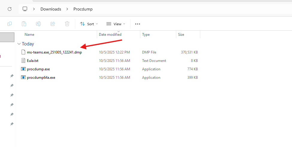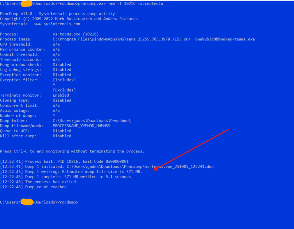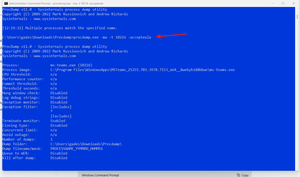 Now I will run this command in command prompt –> procdump.exe -ma -t 10216 -accpteula (procdump.exe: process for proc-dump || -ma: Write a ‘Full’ dump file || -t: means terminate || 10216: is the process number associated with Teams app you can find it from task manager) and wait for the Teams app to crash now , once Teams app is crashed it will automatically write the dump