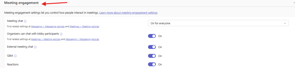 then set Meeting engagement settings, it let you control how people interact in meetings