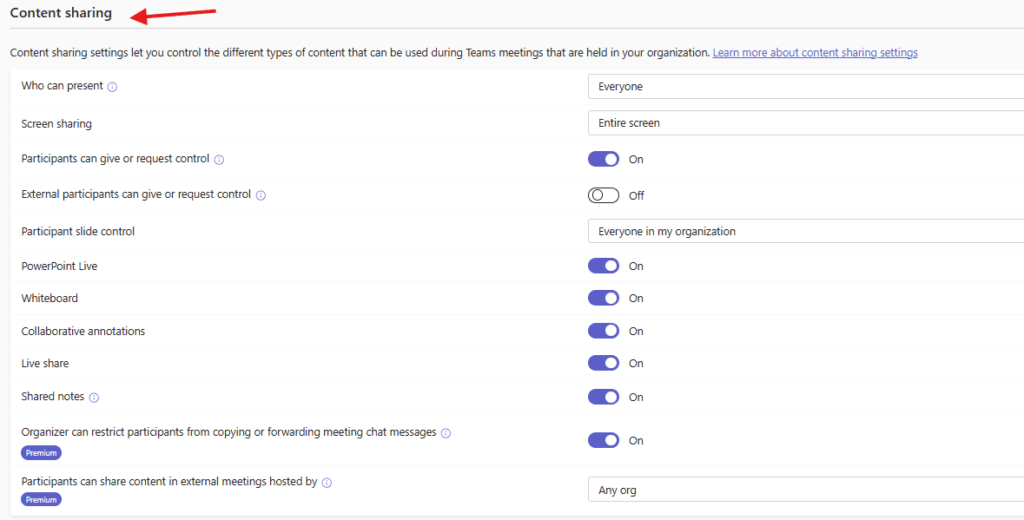 then set Content sharing settings, it let you control the different types of content that can be used during Teams meetings that are held in your organization