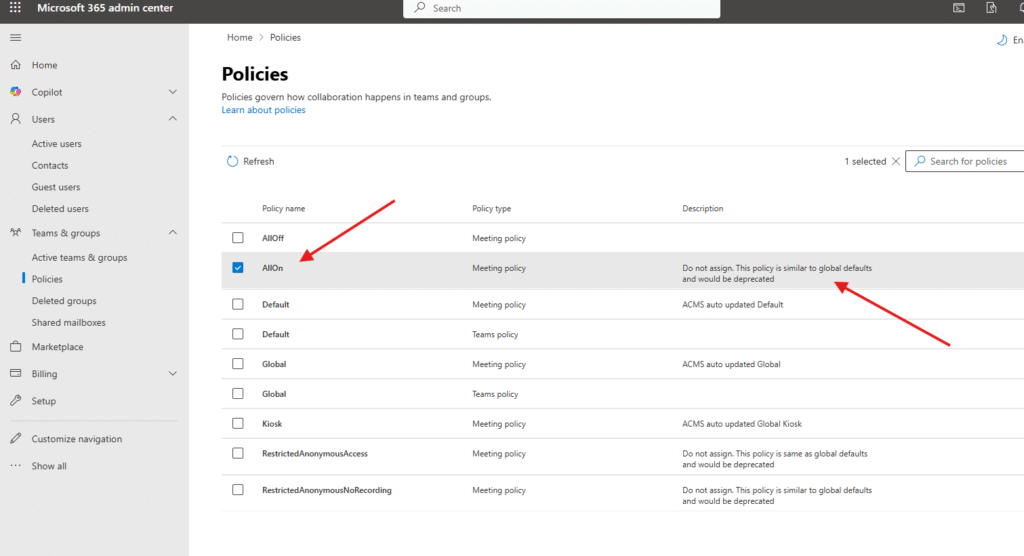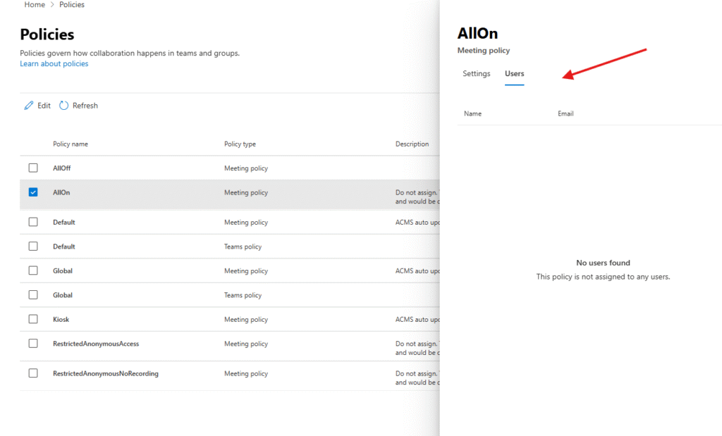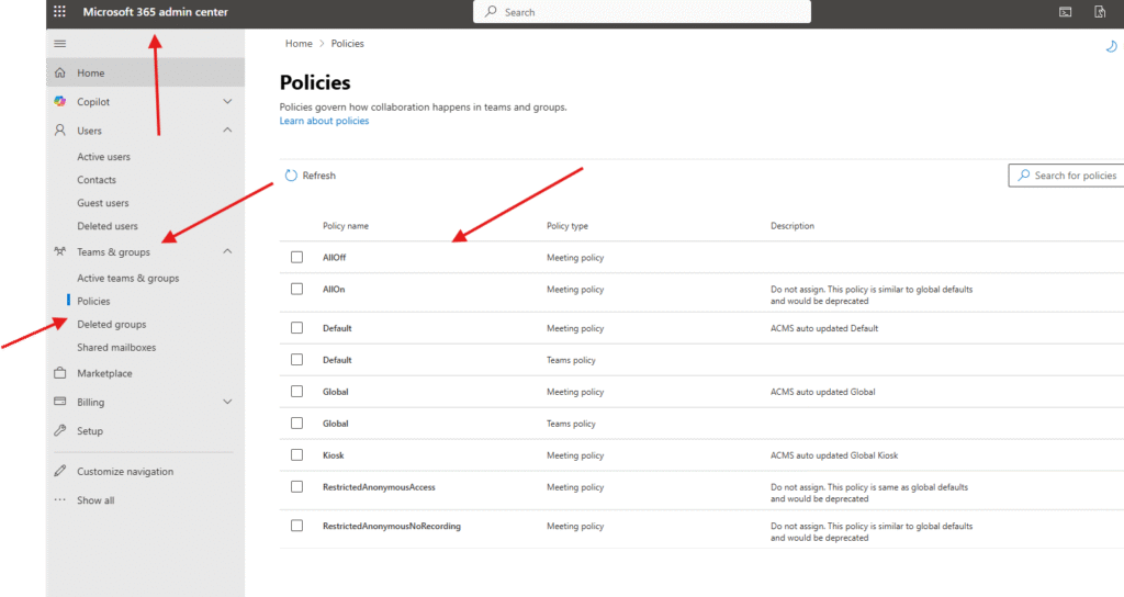 Navigate to Teams & groups –> Policies –> All policies are listed here ( see below snippet)