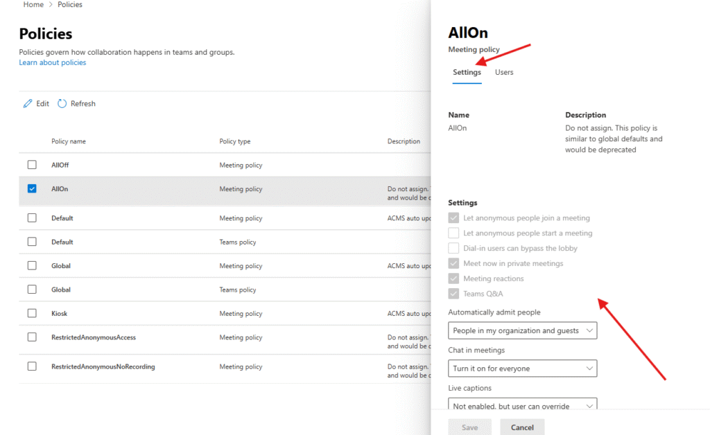 @{Name="AllOn"; AllowMeetNow=$true; AllowAnonymousUsersToStartMeeting=$true; AllowCloudRecording=$true; AllowTranscription=$true; MediaBitRateKb=5000},