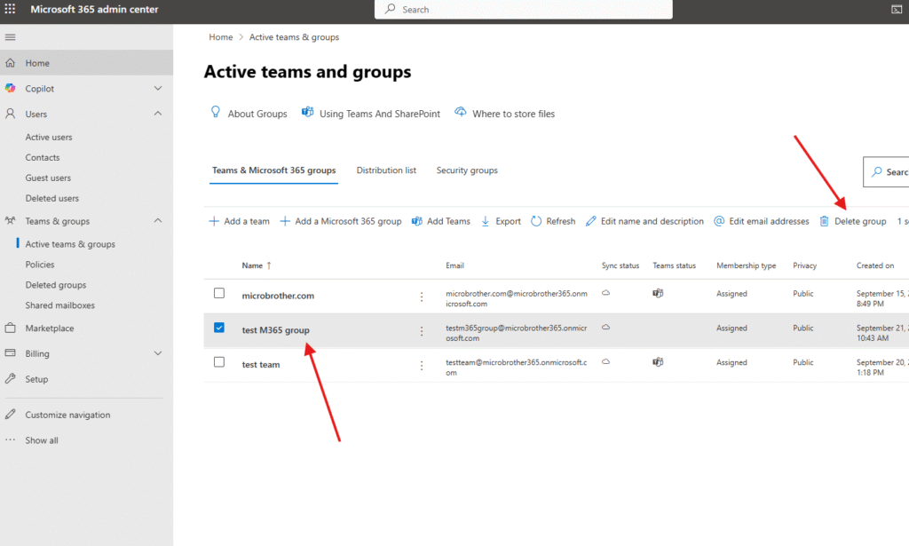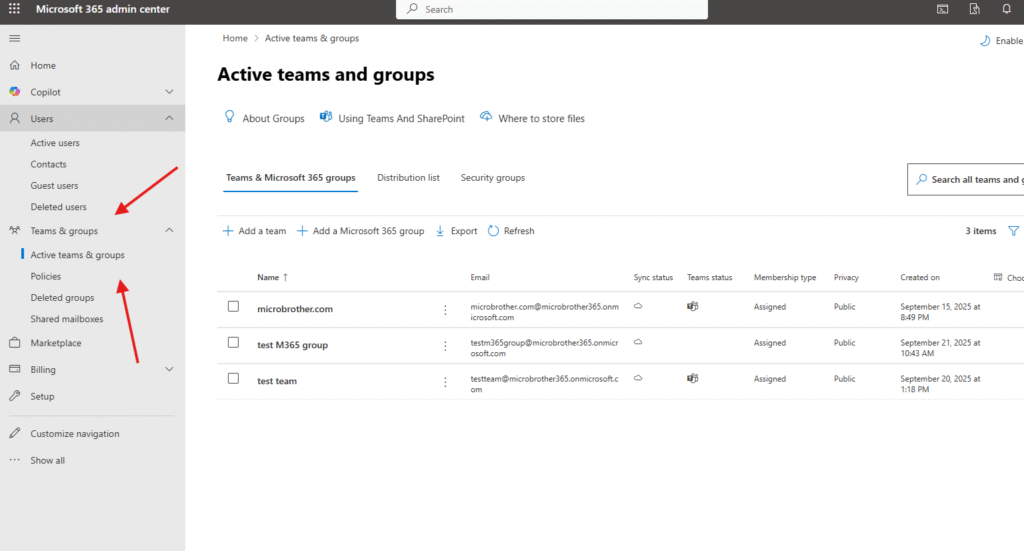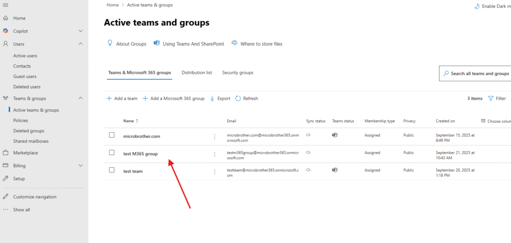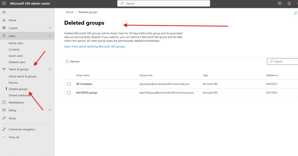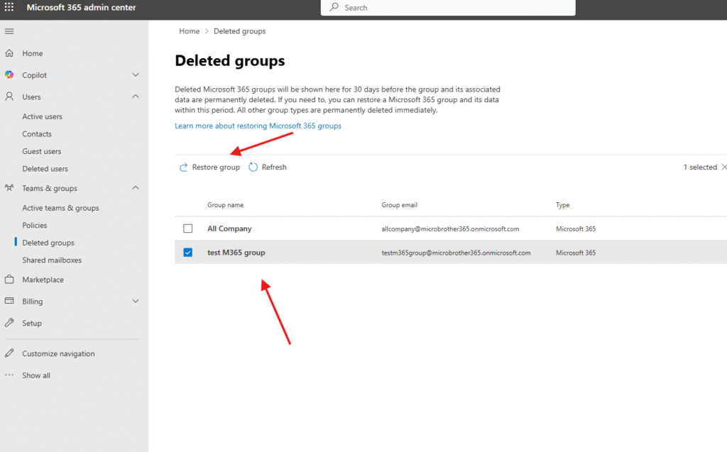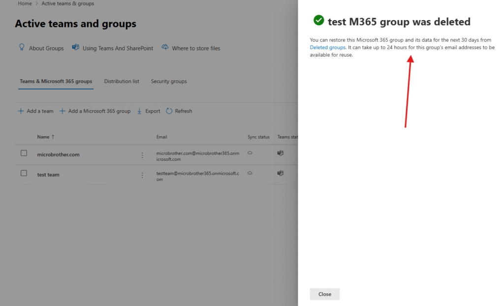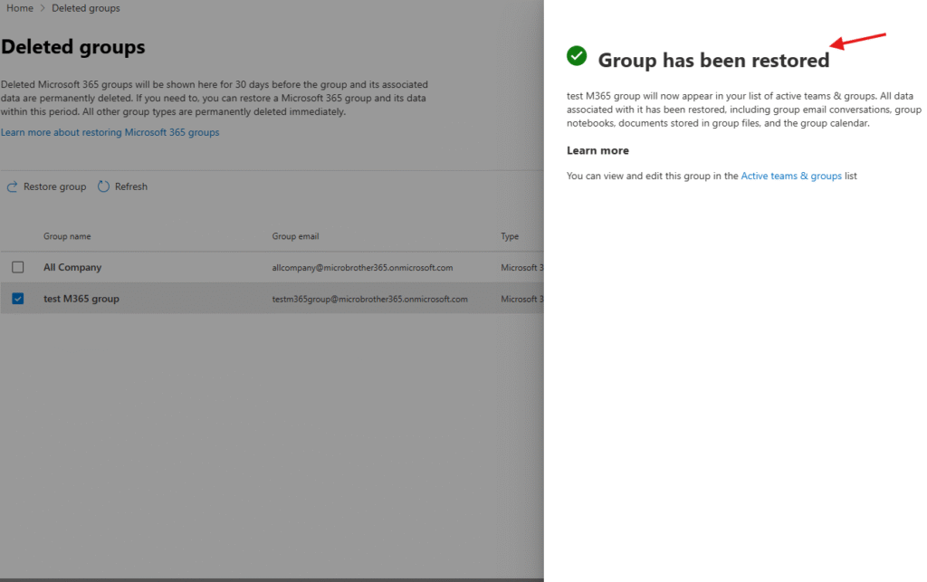 Now navigate to Teams & groups –> Active Teams & groups –> restored group will be visible