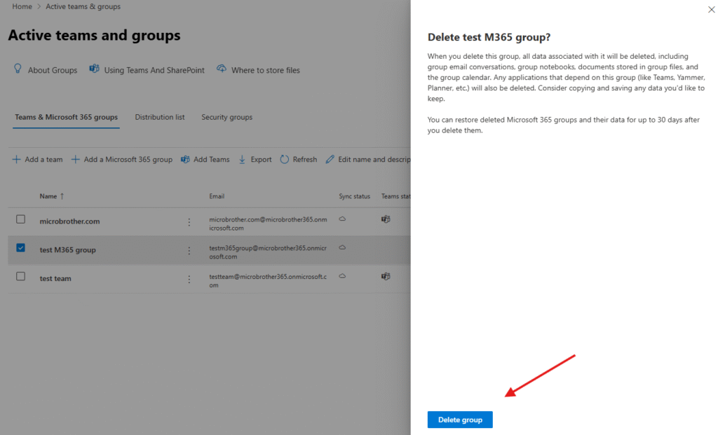 When you delete this group, all data associated with it will be deleted, including group email conversations, group notebooks, documents stored in group files, and the group calendar. Any applications that depend on this group (like Teams, Yammer, Planner, etc.) will also be deleted. Consider copying and saving any data you’d like to keep. You can restore deleted Microsoft 365 groups and their data for up to 30 days after you delete them.