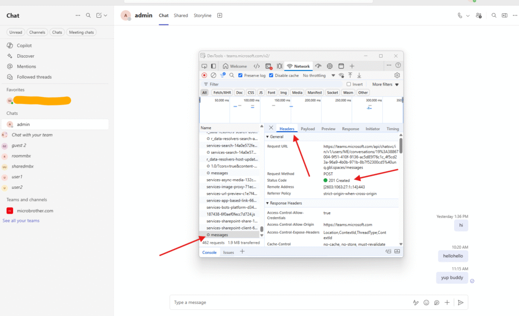 Now start reproducing the issue e.g. I have sent one message to admin user –> I was able to send message and in the header section I can see the request as 201