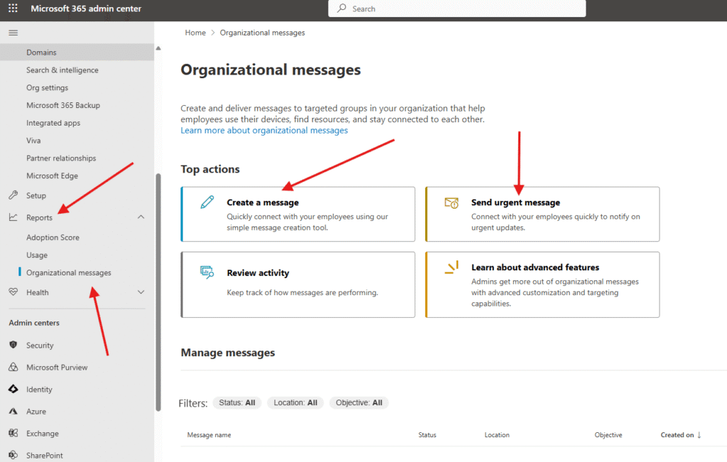 Navigate to Reports –> Organizational messages–> create a message or send urgent message