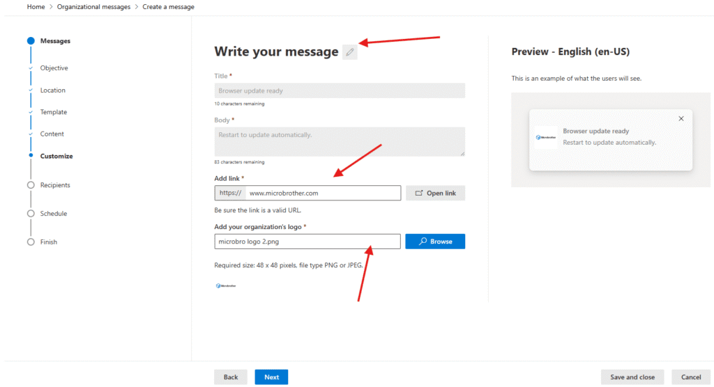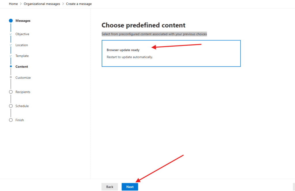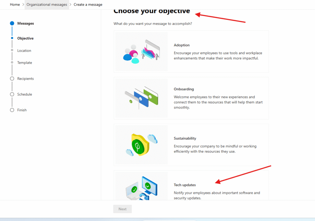 for an example I will create a message, Choose your objective viz what do you want your message to accomplish? I will demonstrate: Tech updates option –> hit next