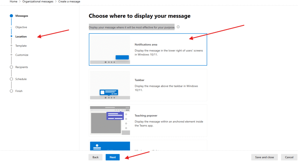 Choose where to display your message: Display your message where it will be most effective for your purpose–> I will select Notifications area