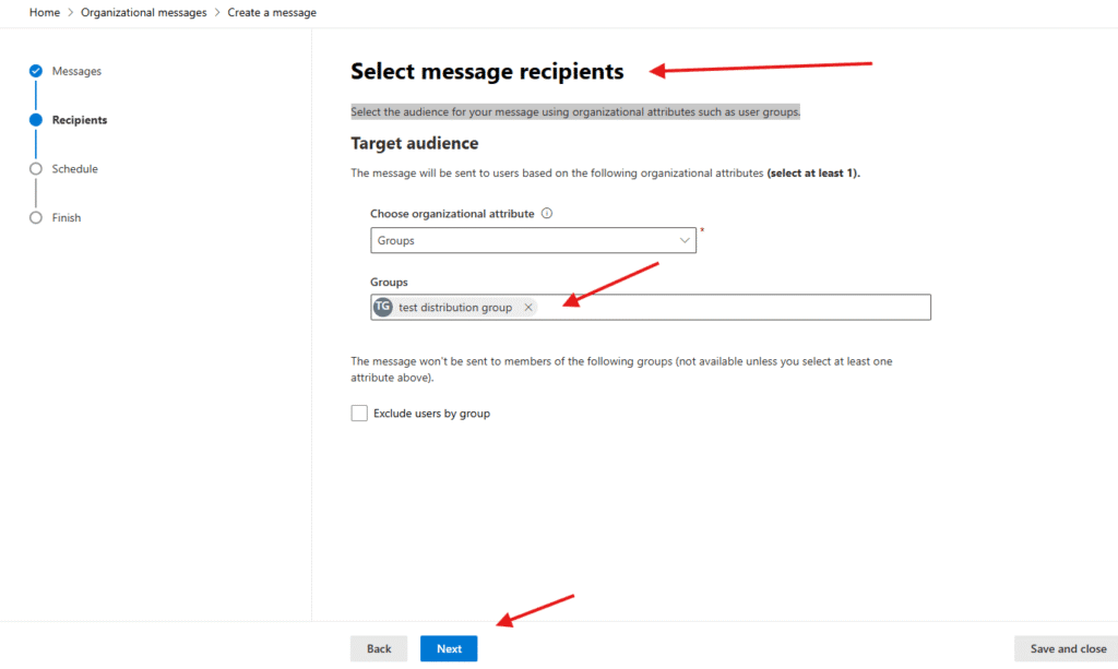 Select message recipients–> Select the audience for your message using organizational attributes such as user groups –> hit next