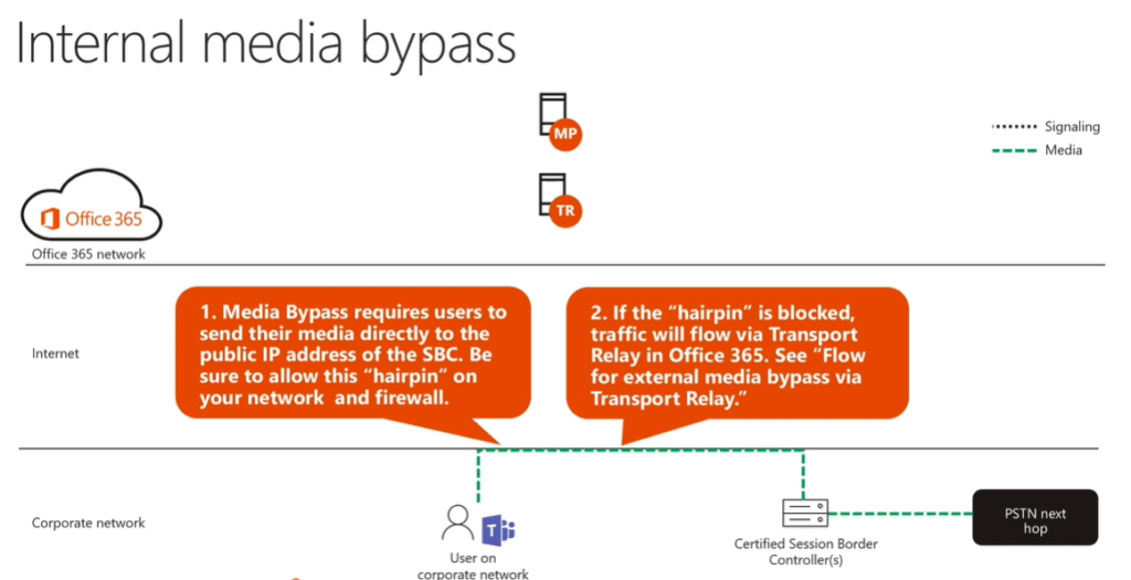 In the internal media bypass scenario internal user aka corp network user will send media ( post establishing signal) directly to the Public IP address of the SBC, networking team has to allow hair pin on our network and firewall ( if the hair pin is blocked traffic will flow via Transport relay aka TR in M365 network )