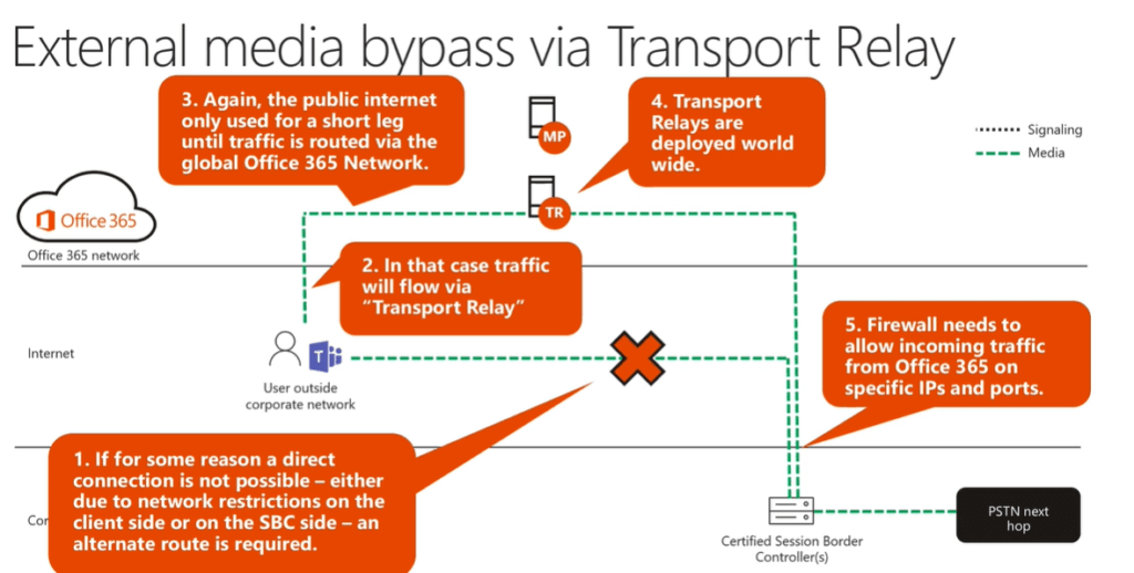 In this scenario for some reason an internet user is not able to send media directly over the internet either due to network restriction on the client side or on SBC side, an alternate route is required, in that case traffic will flow via Transport relay viz TR, Transport relays are deployed worldwide they will send media to the SBC on specific IP’s and ports.