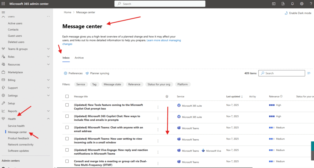 Navigate to Health–> Message center –> Inbox –> Each message gives you a high-level overview of a planned change and how it may affect your users, and links out to more detailed information to help you prepare