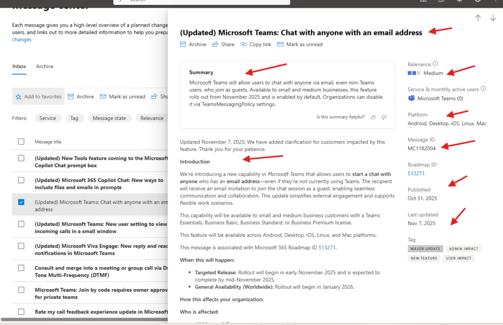for an example we will see this MC1182004 Microsoft Teams: Chat with anyone with an email address –> Microsoft Teams will allow users to chat with anyone via email, even non-Teams users, who join as guests. Available to small and medium businesses, this feature rolls out from November 2025 and is enabled by default. Organizations can disable it via TeamsMessagingPolicy settings