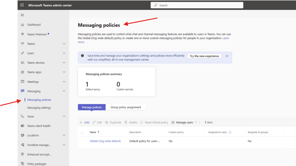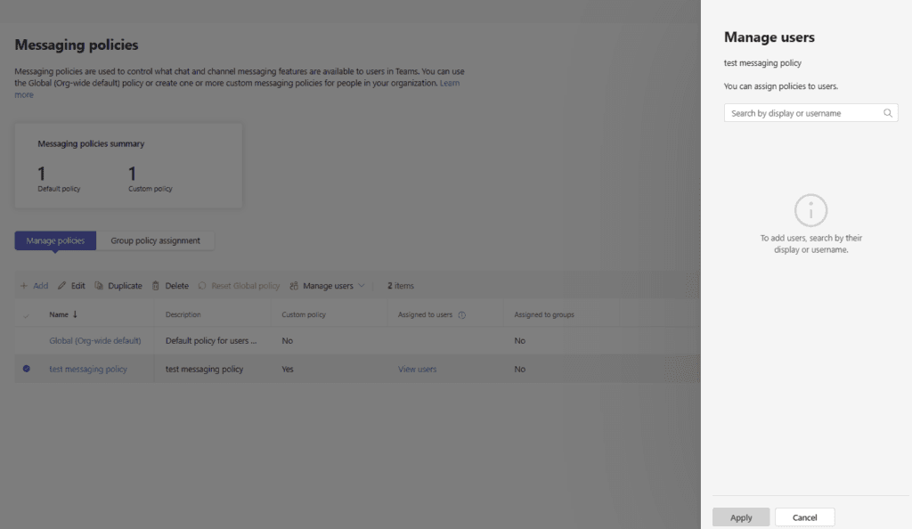 Messaging policies are used to control what chat and channel messaging features are available to users in Teams. You can use the Global (Org-wide default) policy or create one or more custom messaging policies for people in your organization