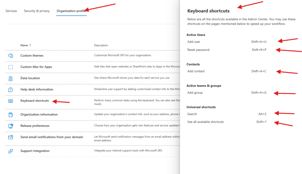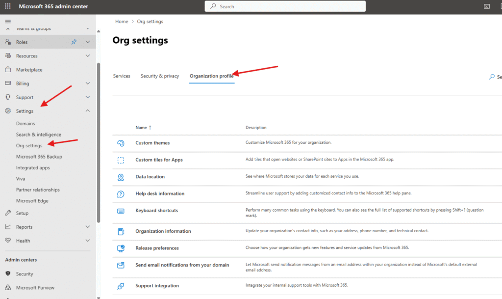 In Org profile settings of O365 we have things like Data location, help desk information, Keyboard shortcuts, release preference and support integration etc
