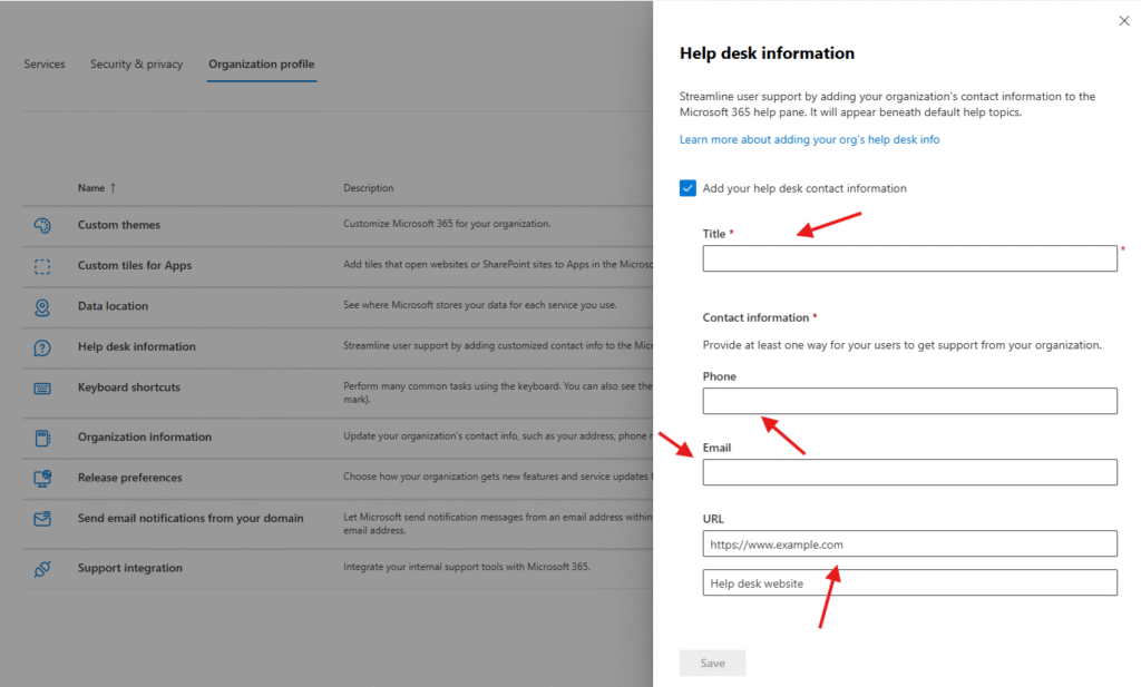Help desk information : Streamline user support by adding your organization’s contact information to the Microsoft 365 help pane. It will appear beneath default help topics, click on add your help desk contact info and fill in the details