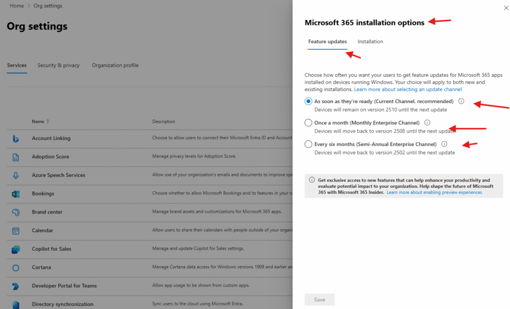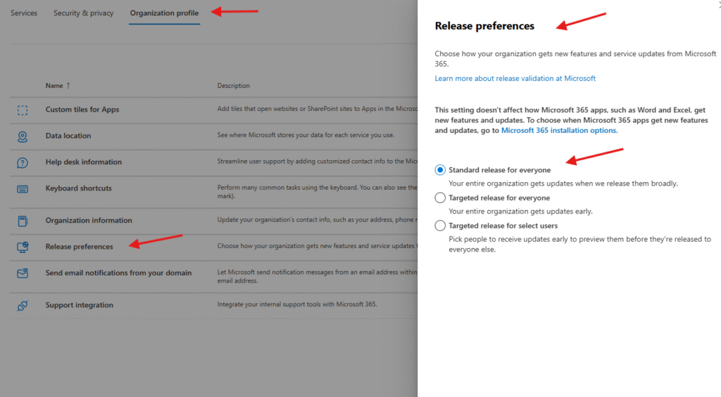 Release preferences : Choose how your organization gets new features and service updates from Microsoft 365. This setting doesn’t affect how Microsoft 365 apps, such as Word and Excel, get new features and updates. To choose when Microsoft 365 apps get new features and updates, go to Microsoft 365 installation options
