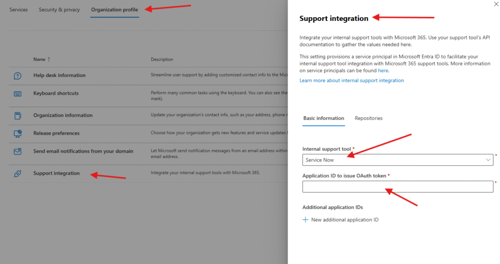 Support integration : Integrate your internal support tools ( e.g. service now ) with Microsoft 365. Use your support tool’s API documentation to gather the values needed here.